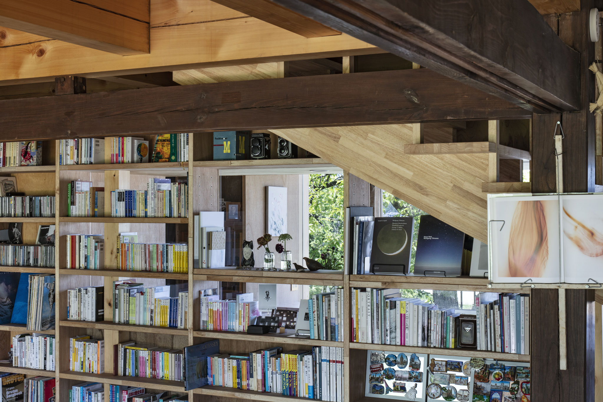 The house turns around a central wall where shelves and stairs are placed.That central focal point is not only of a structural importance as it holds the structural reinforcements, but also stresses the north/south partition of the overall layout. From that central point, we arranged the study on the north side looking up at a beautiful field in the foreground and at chains of mountains in the background. The south side spaces house the living room and dining room and open up to a wooden deck and peaceful adjacent garden. The attic space on the second floor was also rethough in order to not only house three bedrooms but also bring light to the whole house with a new atrium space. The ceilings of the ground floor’s study are made of acrylic panels so as to create a continuum of reflecting lights between the garden and the second floor atrium.
